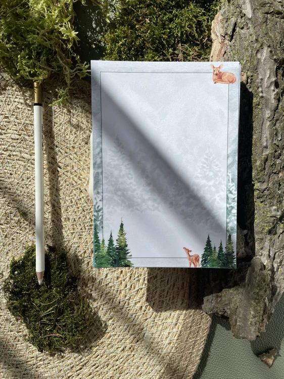 Poznámkový blok Lesní nádech je kouzelný trhací zápisník s motivem zasněženého lesa, který přináší klid a inspiraci do každodenního psaní. Tento poznámkový blok je dostupný ve velikostech A5 a A6, v linkované i nelinkované verzi, a obsahuje 50 listů kvalitního papíru (90 g/m²). Zadní strana je vyrobena z kraftového papíru z recyklovaného kartonu, což z něj činí šetrnou a udržitelnou volbu.