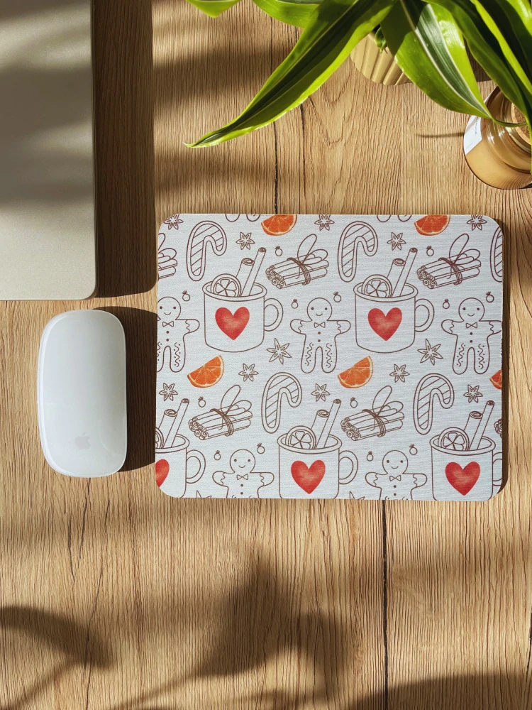 Minimalistická vánoční podložka pod myš s jemnými obrysy perníčku, skořice, hrníčku a kousky pomeranče, doplněná akvarelovými barevnými prvky.