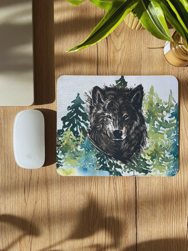 Podložka pod myš s černobílým výrazným vlkem v kontrastu s akvarelovým pozadím lesa.